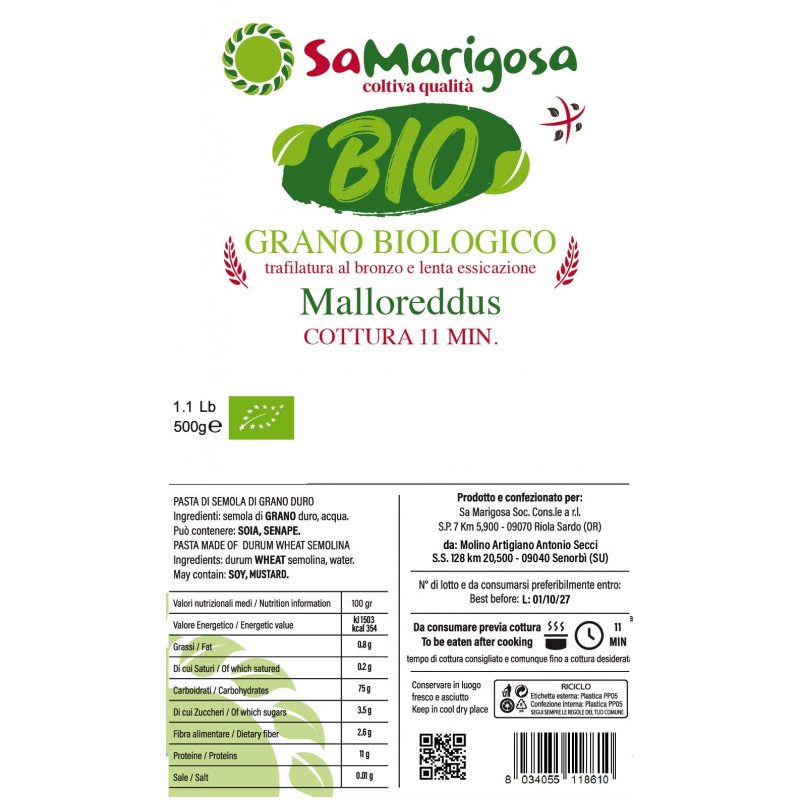 La pasta Sa Marigosa è prodotta utilizzando esclusivamente grano duro sardo * da Agricoltura BIOLOGICA, coltivato e raccolto nei nostri campi in Sardegna.